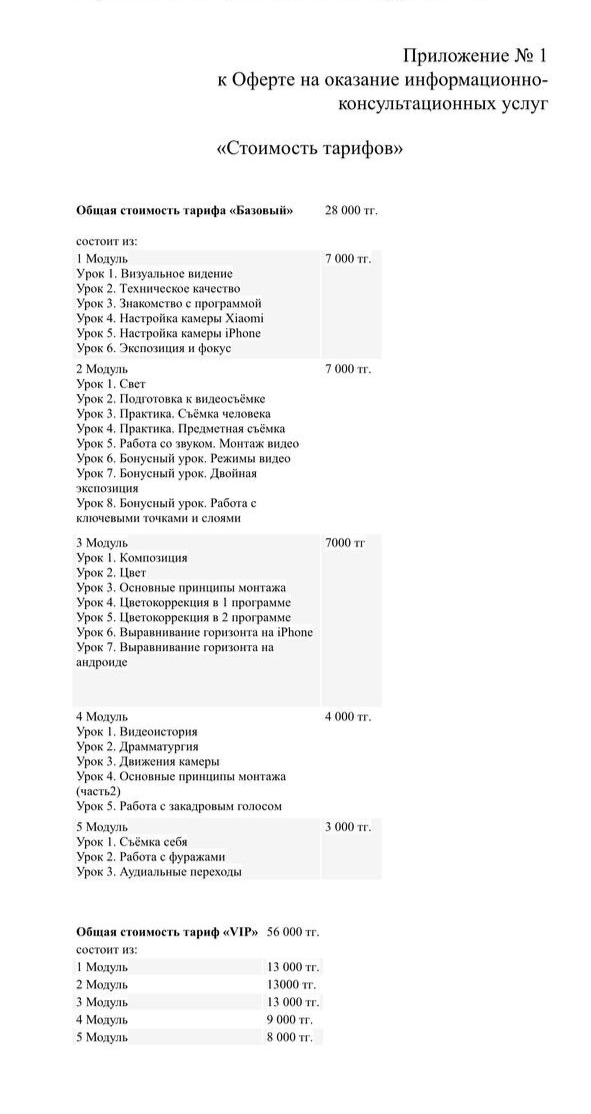 Курс - совокупность услуг по предоставлению доступа к видеоурокам и онлайн сессиям, оказываемых в соответствии с Тарифом при помощи сети Интернет, объединенных единой тематикой и направленные на самостоятельное приобретение Заказчиком знаний и навыков по соответствующей теме. Все материалы, входящие в состав Курса являются произведениями в смысле ст. 971 ГК РК.