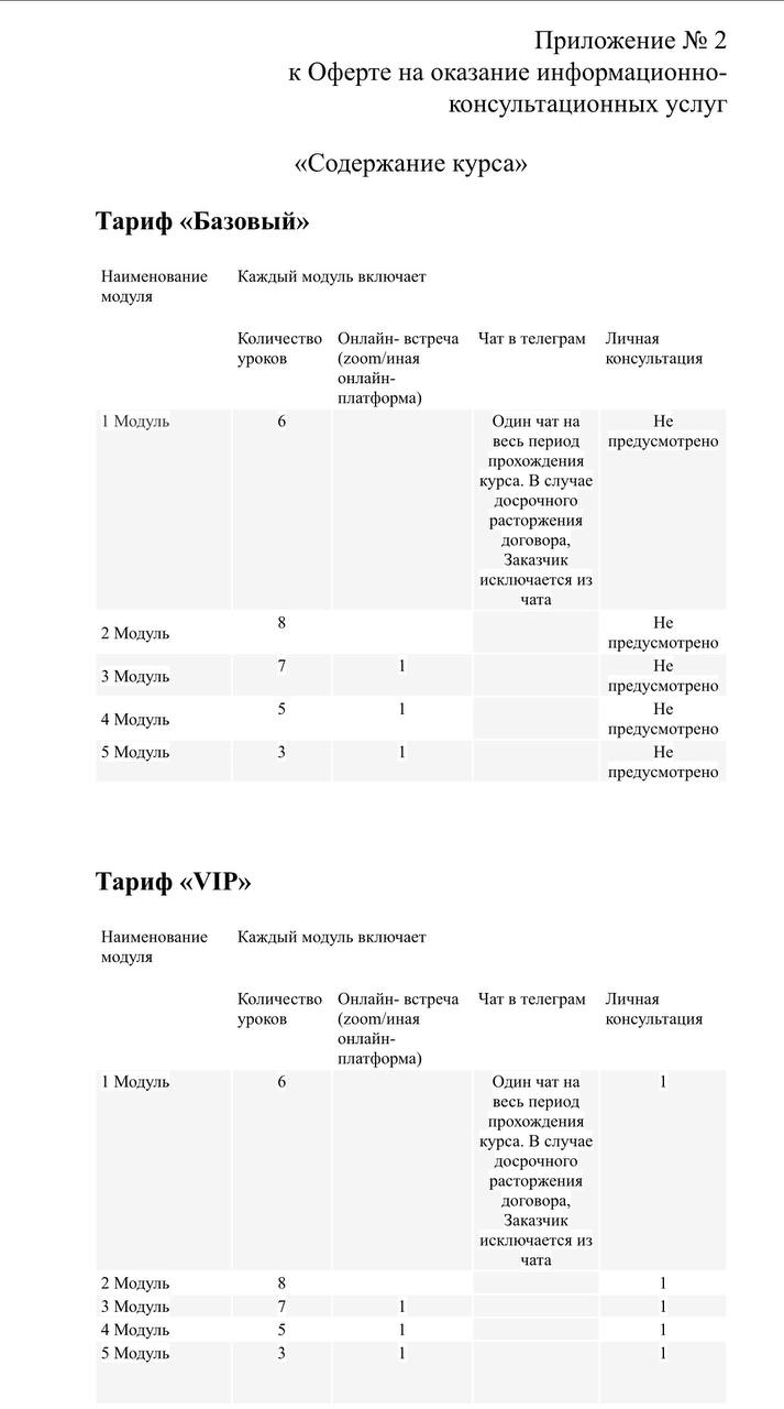 Стоимость отдельных модулей / видео уроков и онлайн сессий, входящих в состав курса, определяется по формуле: стоимость курса согласно тарифу – стоимость предоставленных Заказчику модулей/уроков и онлайн сессий, предусмотренных тарифом. Тарифы, а также стоимость каждого модуля определяются в соответствии с приложением к настоящему Договору. Расчет полученных услуг производится от полной стоимости выбранного тарифа, вне зависимости от полученной скидки. При этом стоимость возврата не может превышать оплаченную потребителем сумму.